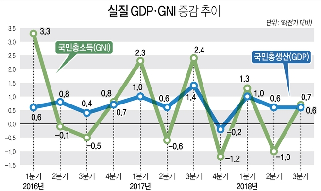 3분기 실질 국민총소득(GNI·계절조정기준)은 전 분기보다 0.7% 증가했다. 유가 상승으로 교역조건이 악화했지만 국외순수취요소 소득이 흑자가 되면서 개선됐다.