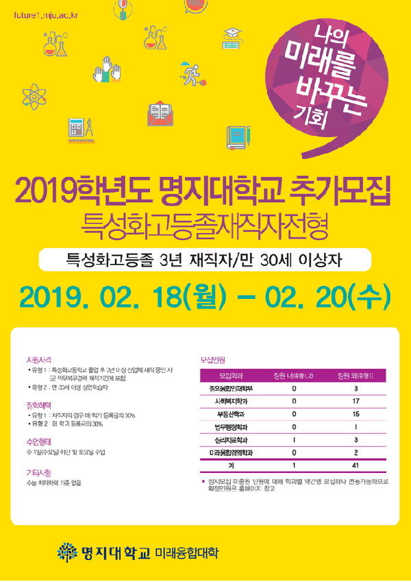 (조세금융신문=구재회 기자) 명지대학교 미래융합대학은 2019학년도 신입생 약간명을 모집한다.