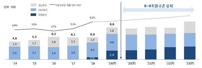 이에 따라 현대차의 2019~2023년 연평균 투자액은 약 9조원으로 과거 5개년 연평균 투자액(약 5조7000억원)과 비교하면 58% 이상 늘어난 규모다.
