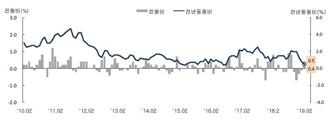 5일 통계청이 발표한 ‘2019년 2월 소비자물가동향’에 따르면 지난달 소비자물가 상승률(전년 대비)은 0.5%로 집계됐다. 이는 전월 0.8%보다 0.3%p 하락한 수치며 지난 2016년 8월(0.5%) 이후 가장 낮은 수치다.