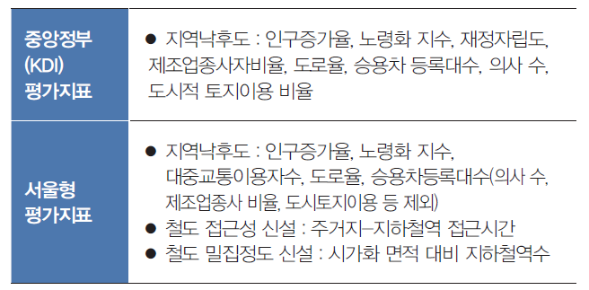 서울시는 향후 예비타당성 조사에 대비하여 사업실행력을 확보하기 위해 경제적 타당성(B/C 0.85 이상) 최소조건을 만족하는 노선 중 서울형 지역균형발전 평가지표에 따라 이번 노선계획을 수립한다고 한다. 또한 계획의 선정기준에는 부합하지 못했지만 지역균형발전 지수가 높은 노선(난곡선 금천연장(난향동~금천구청), 7호선 급행화 등은 후보노선으로 선정해 5년 후 10개년 도시철도망구축계획 변경검토 시 변화된 여건에 따라 노선별 사업타당성을 재검증할 계획이다. 평가지표 개선안은 <표1>과 같다.