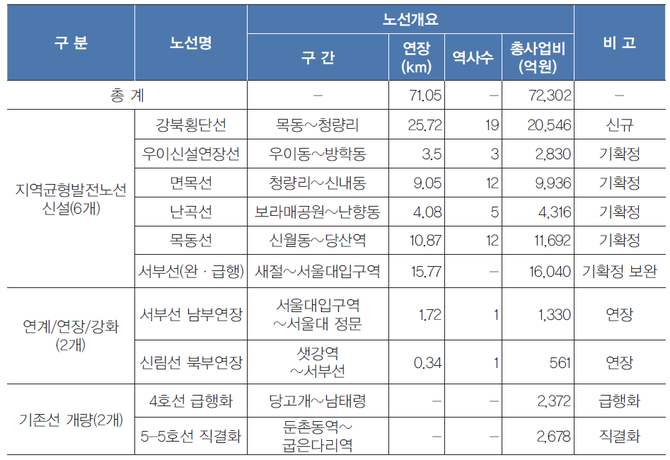 이중 규모가 가장 큰 강북횡단선은 강·남북 지역균형발전 추진을 위한 전략노선으로 필요시 시민펀드 모집 등도 고려하여 별도 재원마련을 통해 시민 공유형 재정사업으로 추진할 계획도 있다.