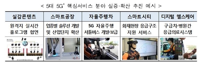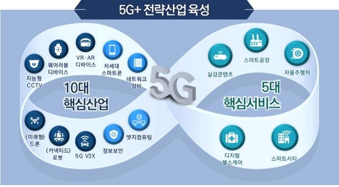 아울러 정부는 5대 핵심서비스와 함께 ▲차세대 스마트폰 ▲네트워크 장비 ▲엣지 컴퓨팅 ▲정보보안 ▲V2X(차량통신기술) ▲로봇 ▲드론 ▲지능형 폐쇄회로(CC)TV ▲웨어러블 디바이스 ▲AR·VR 디바이스 등을 ‘10대 핵심산업’으로 선정했다.