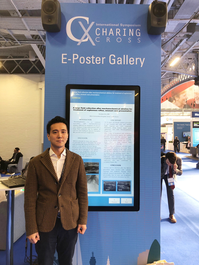 민트병원 김건우 원장은 하지정맥류 치료 중 하나인 클라리베인 치료 후 환자 증례를 발표했다. 김건우 원장이 제출한 <A large fluid collection after mechanochemical ablation for treatment of saphenous reflux, unusual case presentation>은 클라리베인 시술 후 흔치 않게 나타나는 특이증상과 그 해결방법을 다루었다.