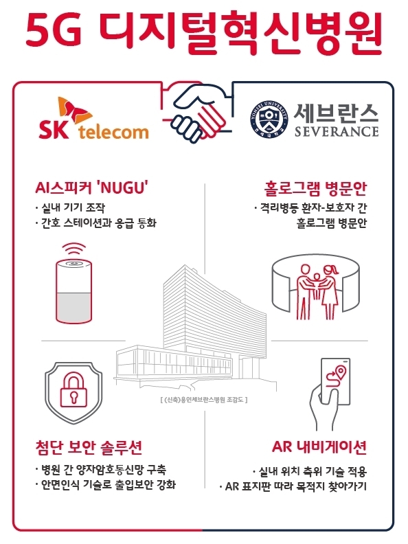 이에 따라 SK텔레콤과 연세의료원은 오는 2020년 2월 개원 예정인 용인세브란스원에 5G 망을 구축하고 특화 솔루션을 개발하기로 뜻을 모았다. 의료기관의 메인 통신망이 5G로 구축되는 것은 국내 최초다.