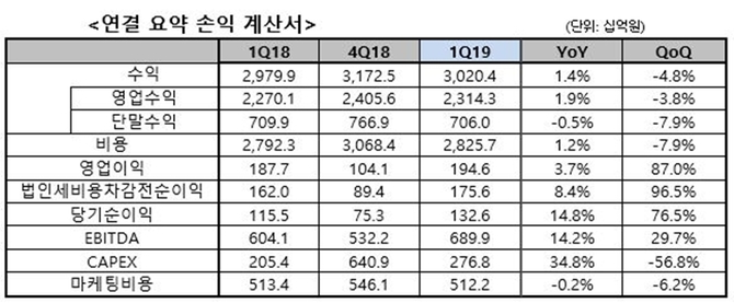 올해 1분기 마케팅 비용은 5122억원을 집행해 전년 동기 대비 0.2% 감소했고 설비투자비용(CAPEX)는 5G 네트워크 투자가 본격화됨에 따라 전년 동기 대비 34.8% 증가한 2768억원을 기록했다.