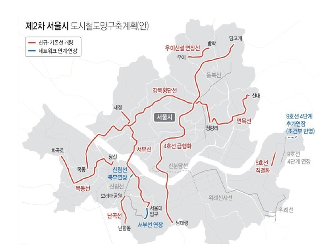 그러나 도시철도가 지나가는 곳은 지가가 상승하고 집값이 상승하는 등 부작용도 발생하고 있으나 아직도 도시철도의 혜택을 받지 못하고 소외받는 지역도 상당히 있어 이번에 10곳에 대해 제2차 서울시 도시철도망 구축계획을 발표한 것이다.
