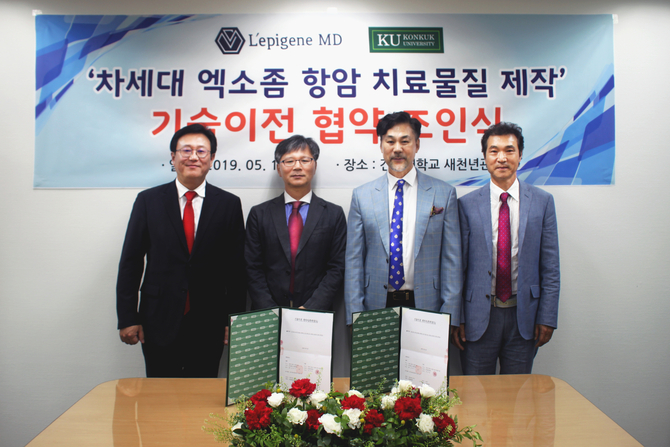 ㈜레피겐엠디는 지난 15일 건국대학교 산학협력단 송창선 단장과 기술 발명자 김진회 교수, 레피겐엠디 박영광 대표 등 양 기관 관계자들이 참석한 가운데 차세대 엑소좀 항암물질 제작 기술이전 협약을 체결했다고 21일 밝혔다..