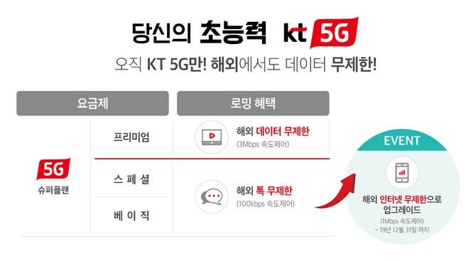 (조세금융신문=김성욱 기자) KT는 5G 요금제 전 라인업에 대한 데이터로밍 혜택 강화 프로모션을 진행한다고 1일 밝혔다.