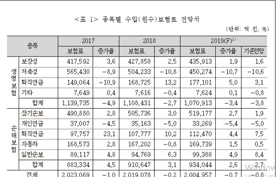 보험연구원은 1일 발간한 '2019년 수입보험료 수정 전망' 보고서에서 보험산업의 수입보험료는 2017년부터 3년 연속 역성장을 기록할 것으로 전망된다며 이같이 밝혔다.
