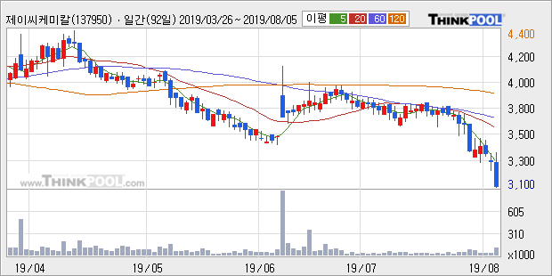 제이씨케미칼의 지난 3년 동안 법인세 납부액 추이를 보면 각각 52억원, 16억원, 10억원으로 매년 감소하고 있다.