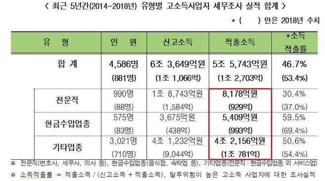 지난 5년간 고소득사업자에 대한 세무조사 실적을 보면, 전문직 고소득자 990명이 1조8743억원을 신고하고 8178억원을 숨겼으며, 현금수입업종 575명이 3675억원을 신고하고 5409억원을 숨겨 세금을 탈루하려다 적발됐다.