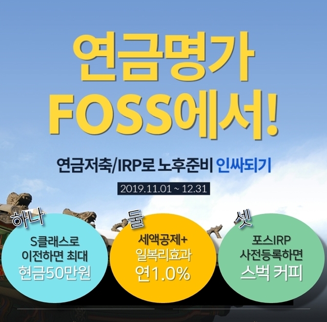 (조세금융신문=김종태 기자) 온라인 증권사 한국포스증권은 연말정산 시즌을 맞아 ‘연금명가 FOSS에서 연금/IRP로 노후준비 인싸되기’ 이벤트를 진행한다고 5일 밝혔다.