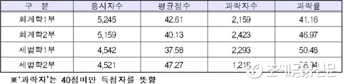 평균 점수가 가장 높았던 과목은 세법학 2부로 4521명이 응시해 47.27점의 평균점수를 기록했고 과락자는 1218명(과락률 26.94%)으로 나타났다. 이어 회계학 1부에는 5245명이 응시해 평균 42.61점으로 과락자수는 2159명(41.16%)이다.