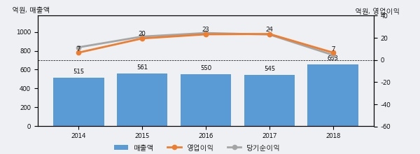 최근 실적을 살펴보면 2018년 매출액이 최근 5년 중 가장 높은 실적을 기록했음을 알 수 있다. 이전 최고 실적이었던 2015년 보다도 16.4%(91억 8천만원) 늘어난 것으로 나타났다.