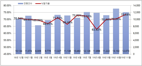 5일 법원경매 전문기업 지지옥션의 경매 동향보고서에 따르면 11월 전국 경매 진행건수는 전달보다 1029건 감소한 1만2073건을 기록했다. 이 가운데 4099건이 낙찰됐다.