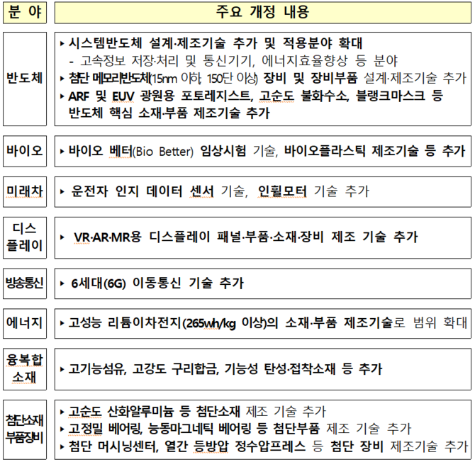 첨단 메모리반도체(15nm 이하, 150단 이상) 장비 및 장비부품 설계·제조기술과 ARF 및 EUV 광원용 포토레지스트, 고순도 불화수소, 블랭크마스크 등 반도체 핵심 소재·부품 제조기술 등도 세제혜택을 받게 된다.