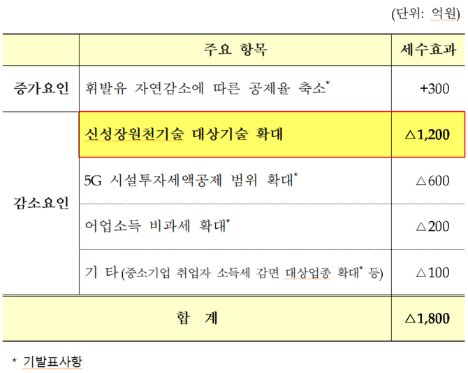 정부는 2020년 세입예산안에서 세법 시행령 개정으로 인해 휘발유 자연감소에 따른 공제율 축소로 300억원 증세효과가 발생하고, 5G시설투자세액공제 범위 확대로 600억원, 어업소득 비과세 확대로 200억원, 중소기업 취업자 소득세 감면 대상업종 확대 등으로 100억원 세제지원 효과가 나온다고 밝힌 바 있다. 여기에 신성장원천기술 대상기술 추가 지원 1200억원이 신규 포함됐다.