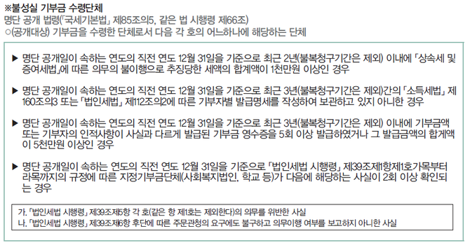 이들의 명단 공개는 2014년 이후 여섯 번째인데, 2019년까지 공개된 총인원은 ▲불성실 기부금 단체가 364곳 ▲조세포탈범 178명 ▲해외금융계좌 신고의무 위반자 7명이다. 불성실 기부금 수령단체 공개대상은 거짓기부금 영수증을 발급했거나 기부금 영수증발급명세서를 작성·보관하지 않은 단체 및 상속·증여세법상 의무불이행한 단체이다.