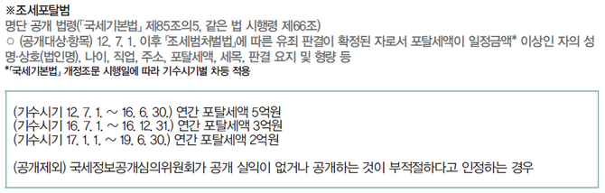 또 조세포탈범 공개대상은 도박사이트 등 불법사업 운영, 차명계좌 사용, 거짓 세금계산서 수취 등 사기나 그 밖의 부정 행위로 조세를 포탈하여 유죄가 확정된 자이고 해외금융계좌 신고의무 위반자 공개대상은 기간 내에 신고하지 않거나 과소신고한 금액이 50억원을 초과한 자들이다.