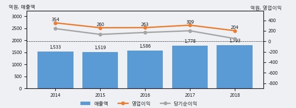 최근 3년간의 실적을 살펴보면 안정적 성장세를 보이고 있다. 최근 3년간 매출로 볼 때 매년 증가하고 있다. 다만 최근에 그 증가폭이 다소 감소하고 있다.