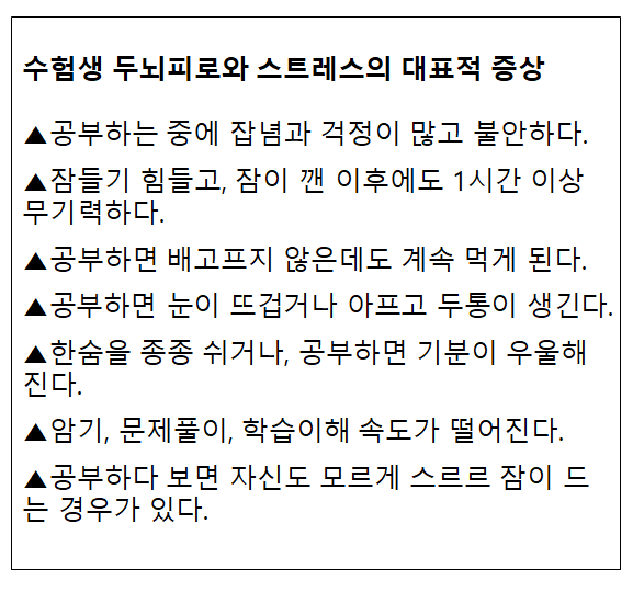 이런 증상들은 체력이 부족해서 발생하는 것이 아니라, 두뇌피로와 스트레스를 해소시키는 회복력의 균형이 깨진 증상으로 집중력과 학습능률까지 떨어지게 되어 수험생들은 항상 주의해야 한다.