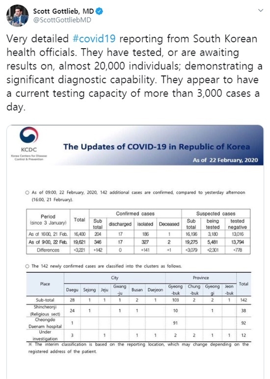 최근 코로나19의 급속한 지역사회 확산 탓에 진원지인 중국 다음으로 전세계 가장 많은 이목이 쏠리고 있다. 하지만 전 미국 FDA 국장 스콧 코틀릿은 22일 자신의 트위터에 글을 올려 한국 보건당국의 코로나19 대처 역량을 치켜 세우는 게시물을 올려 눈길을 끌고 있다.