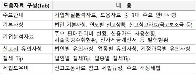절세 Tip 탭에서는 납세자가 놓치기 쉬운 공제・감면, 세제혜택을 법인별 상황에 맞춰 알려주고, 세법 도우미 탭에서는 신고도움자료와 연관된 세법규정과 최근 주요 개정세법을 법인 유형에 따라 안내하는 ‘세법도우미’도 확대 제공한다.