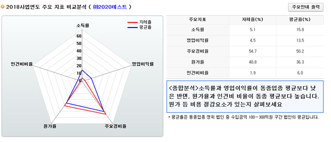 올해 첫 제공하는 기업체질정보에서는 소득률, 원가율, 경비율 등 주요 경영지표를 같은 업종을 영위하는 법인의 평균과 비교하여 시각화해 확인할 수 있다.