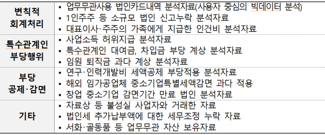 유형별・업종별 개별분석자료, 법인카드 관련 업종(학원비, 의료비 등)과 사용패턴(주소지 인근 사용 등) 등을 분석한 업무무관 혐의내역 등은 빅데이터 분석을 거쳐 더욱 정교해진 자료를 전달한다.