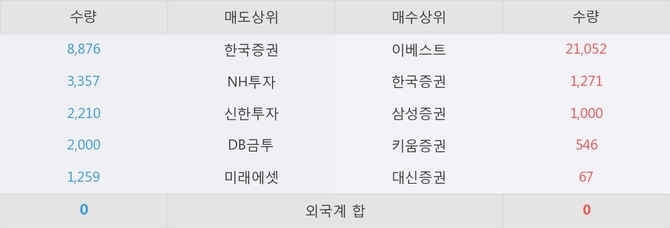 아직까지 외국계 증권사 창구를 통한 매매는 발생하지 않고 있다. 그리고 이 시간 한국증권이 매수창구상위에 올라있는 종목은 이 종목 이외에도 금호타이어, HDC현대EP 등이 있다.