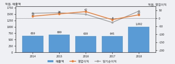 최근 실적을 살펴보면 2018년 매출액이 최근 5년 중 가장 높은 실적을 기록했음을 알 수 있다. 이전 최고 실적이었던 2015년 보다도 43.3%(302억 5천만원) 늘어난 것으로 나타났다.