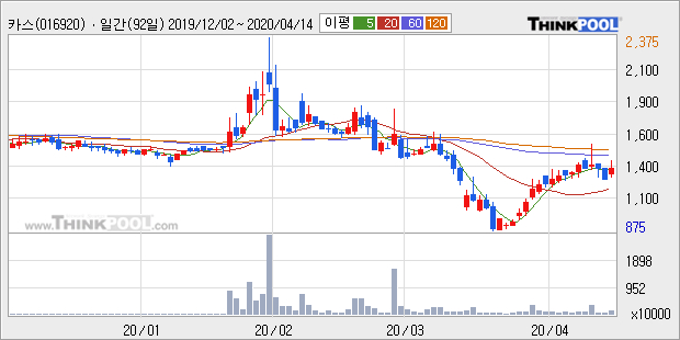 카스의 2019년 매출액은 전년대비 -3.0% 줄어든 1358억원이고, 영업이익 역시 전년대비 -50.3% 줄어든 37억원을 기록했다. 이 회사의 매출액 증감률과 영업이익 증감률은 각각 코스닥 하위 33%, 하위 28%에 해당된다.