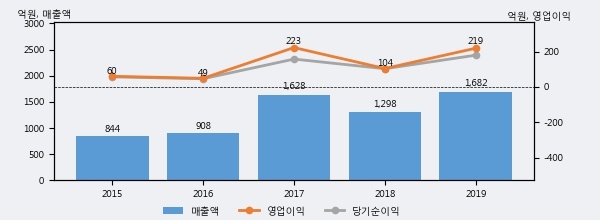 최근 실적을 살펴보면 2019년 매출액이 최근 5년 중 가장 높은 실적을 기록했음을 알 수 있다. 이전 최고 실적이었던 2017년 보다도 3.3%(53억 9천만원) 늘어난 것으로 나타났다.