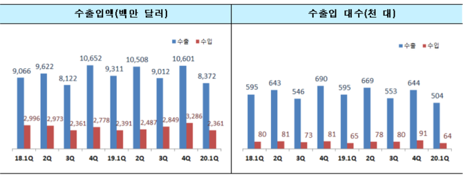 수출대수는 50만 대로 전년 동기 대비 15.2% 감소, 수입대수는 6만 대로 1.4% 감소로 드러났다.