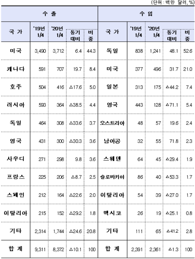 수입 국가별로는 독일(48.1%), 미국(31.7%), 오스트리아(19.6%), 남아공(71.8%) 등은 전년 동기 대비 증가, 일본(△44.2%), 영국(△71.1%), 스웨덴(△29.4%), 슬로바키아(△53.3%) 등은 감소했다.