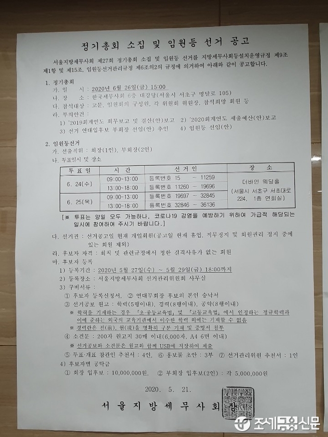 서울세무사회 총회는 예정대로 다음달 26일 한국세무사회 6층 대강당에서 열리며 이날 개표를 통해 당선자를 확정한다.
