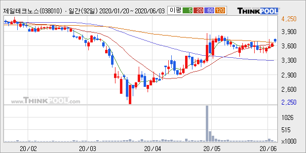 차트상 주가의 흐름은 현재 단기·중기 이평선이 정배열 상태로 전형적인 상승세를 보이고 있다. 최근 이 종목의 차트에서 골든크로스, 삼선전환도(양전환) 등의 특이사항이 발생했다.