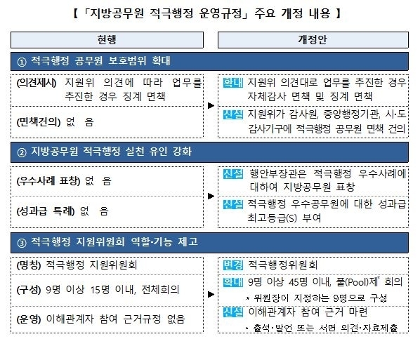 행정안전부는 이러한 내용의 ‘지방공무원 적극행정 운영규정’ 개정안을 입법예고하고, 관련 의견을 수렴한다고 밝혔다.