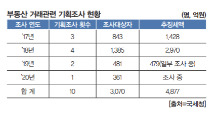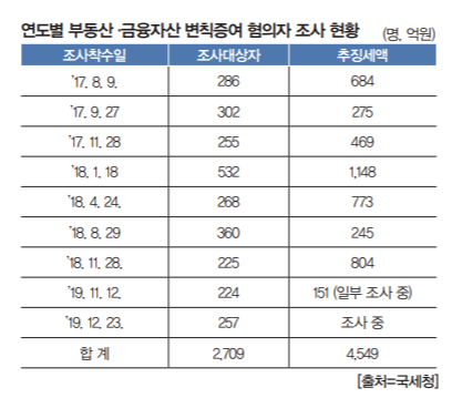 2017년 8월 이후 부동산·금융자산 등을 통한 변칙증여 혐의에 대해 9차례에 걸쳐 2709명을 조사했는데 4549억원의 탈루세액을 추징했다. 또 같은 기간 동안 부동산 거래·금융자산 등을 통한 변칙적 탈루혐의자 3070명을 자금출처조사해서 4877억원의 탈세액을 추징했다.