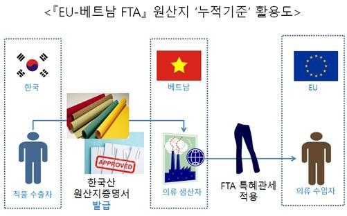 관세청에 따르면 8월 1일부터 발효되는 EV FTA에는 한국산 직물을 사용해 베트남에서 생산한 의류제품을 EU로 수출할 때 한국산 직물을 베트남산으로 본다. 여기에 FTA 특혜관세 혜택을 부여하는 원산지 누적기준이 담겼다.