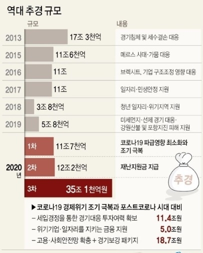 이번 추경은 글로벌 금융위기 당시인 2009년 추경(28조4천억원)을 넘는 역대 최대 규모다.