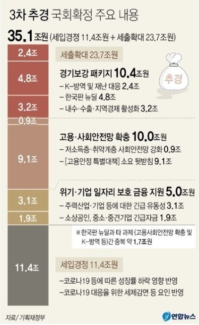 이번 3차 추경에는 고용안전망을 위한 고용안정 특별대책 이행 지원을 위한 9조1천억원, 내수·수출·지역경제 활성화를 위한 온누리상품권 1조원 추가 발행 등 3조2천억원, K-방역 산업 육성 등 2조4천억원 등의 예산이 추가 편성됐다.