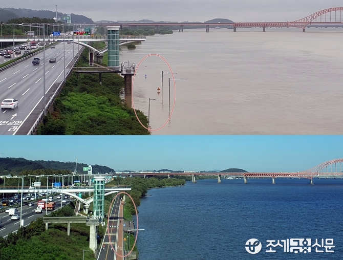 (조세금융신문=김종태 기자) 연일 이어지는 폭우로 한강의 수위가 계속 높아지고 있는 가운데 6일 오전 9시 현재 방화대교 남단 서울 올림픽대로 옆 둔치 자전거도로 및 보행로가 물에 잠겼다.