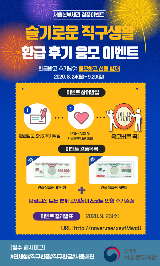 해당 이벤트는 관세청 UNI-PASS 및 서울본부세관 홈페이지를 통해 참여 가능하다. 해외직구 환급후기를 본인의 블로그 및 SNS 등에 올린 후 응모하면 추첨을 통해 10명에게 관광상품권(최우수 10만원, 우수 5만원) 및 기념품 등을 제공한다.