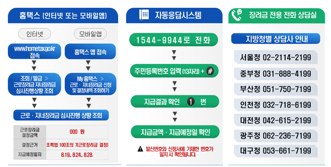 심사·지급 결과는 홈택스나 모바일 손택스, 자동응답시스템(1544-9944), 장려금 전용 전화상담실을 통해 확인할 수 있다.