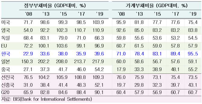 아마도 EU의 재정 준칙인 ‘안정·성장협약’이 제시하는 가이드라인인 ‘GDP 대비 정부부채 60%·재정적자 3%’ 수준에서 논의되지 않을까 싶다. 물론, 글로벌 금융위기 이후 경제 상황이 악화되면서 이 기준을 지키는 EU 회원국들은 거의 없다. 코로나발 경기충격이 쓰나미처럼 밀려오는 상황에서 재정관리에 집착하게 되면 그 피해가 결국 가계부채 채널을 통해 국민들에게 돌아기기 때문이다. GDP 대비 ‘40%’이든 ‘60%’ 이든 논리적 근거가 빈약하기는 매한가지다.