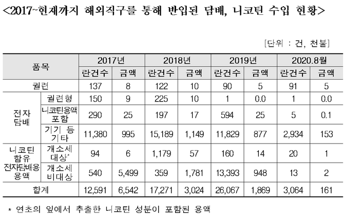 담배와 니코틴에 대한 해외직구는 지난해 총 2만6000여건(한화 21억4560여만원)으로 2018년 1만7271건보다 1.5배 가까이 늘어났다.