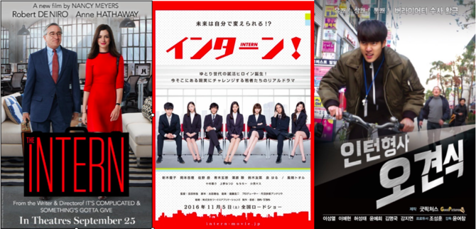 아래 포스터는 미국에서 ‘앤 해서웨이’와 ‘로보트 드니로’가 주연한 인턴(Intern)을 주제로 한 영화와 일본과 한국에서 제작된 인턴에 관련된 영화이다.