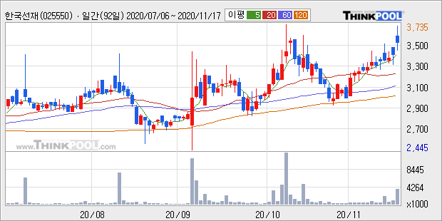 차트상 주가의 흐름은 현재 단기·중기 이평선이 정배열 상태로 전형적인 상승세를 보이고 있다.